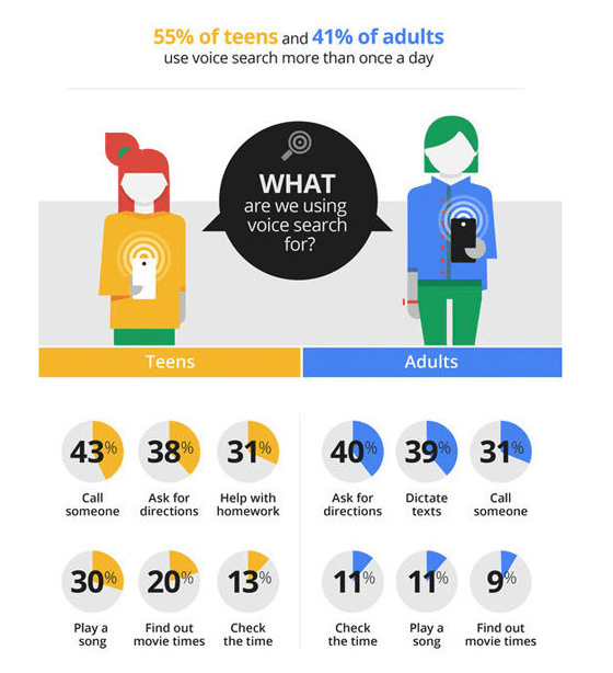 De volgende infographic werd eerder door Google gepubliceerd en laat zien wie voice search vooral gebruiken en waarvoor (binnen de VS). Opvallend: 31% van de tieners in de VS geeft aan voice search te gebruiken als hulp bij huiswerkopdrachten. Uit hetzelfde onderzoek blijkt dat 55% van de tieners en 41% van de volwassenen in de VS meer dan één keer per dag gebruikmaakt van Voice Search.