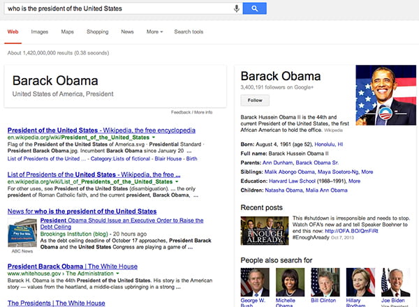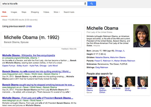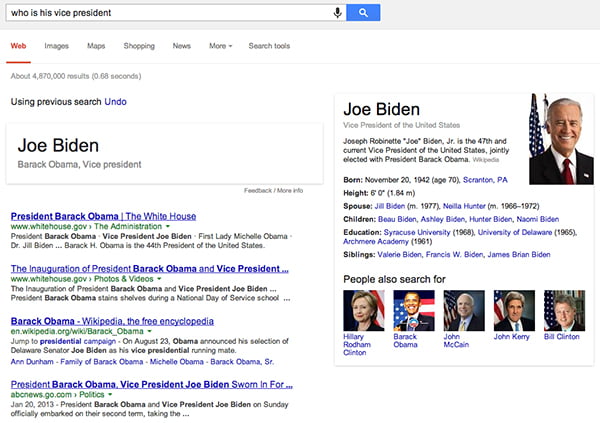 Zelfs na het beantwoorden van de tweede (indirecte) vraag ‘Wie is zijn vrouw?’ kan Google correct antwoord geven op de derde vraag: ‘Wie is zijn vice president?’.