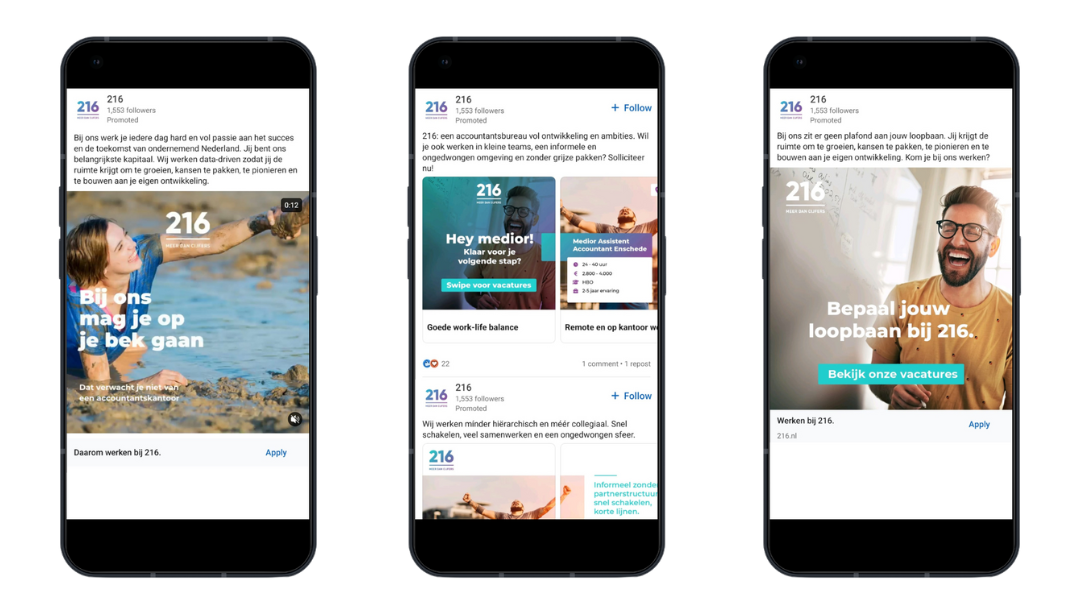Voor ons is een gedegen werken-bij website of pagina daarom een randvoorwaarde voor een succesvolle campagne. Zorg ervoor dat deze hetzelfde gevoel en dezelfde boodschap uitstraalt als jouw spetterende wervingscampagne. Kijk tegelijkertijd vanuit een UX-perspectief naar de pagina’s. Waar lopen kandidaten mogelijk vast in hun candidate journey en waar kun je deze touchpoints optimaliseren? Alleen zo zorg je ervoor dat je niet alleen boven in de funnel jouw vooraf vastgestelde KPI’s weet te behalen, maar zorg je er ook voor dat je de vastgestelde KPI’s aan de onderkant, dit zijn vaak de belangrijkste, ook haalt.