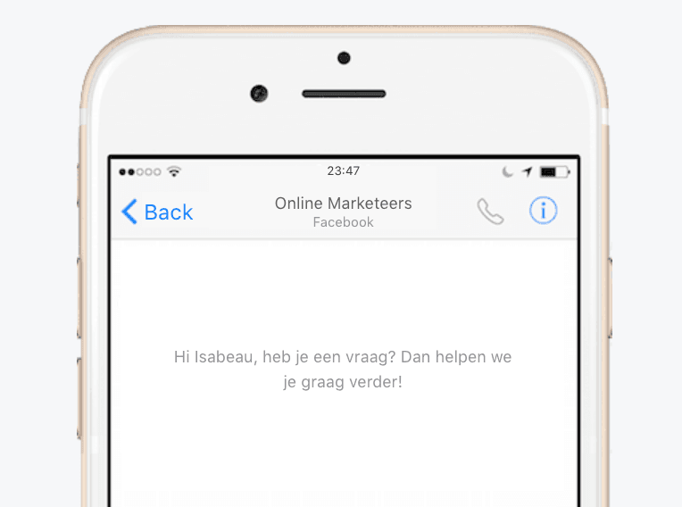 Er zijn drie verschillende opties die je kunt instellen voor je Facebook bedrijfspagina: messenger begroeting, expressreactie en een reactie bij afwezigheid. Alle reacties kun je personaliseren (voornaam en/of achternaam) en/of verrijken met extra informatie (website, telefoonnummer, e-mailadres en/of adres).