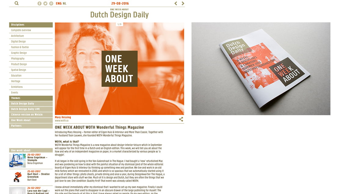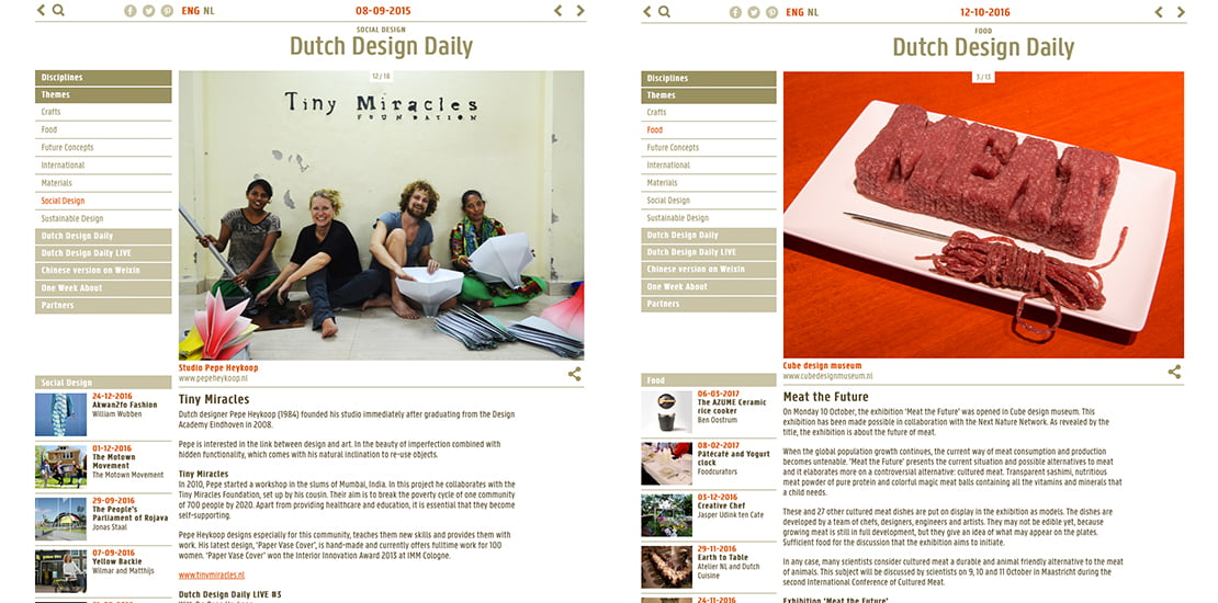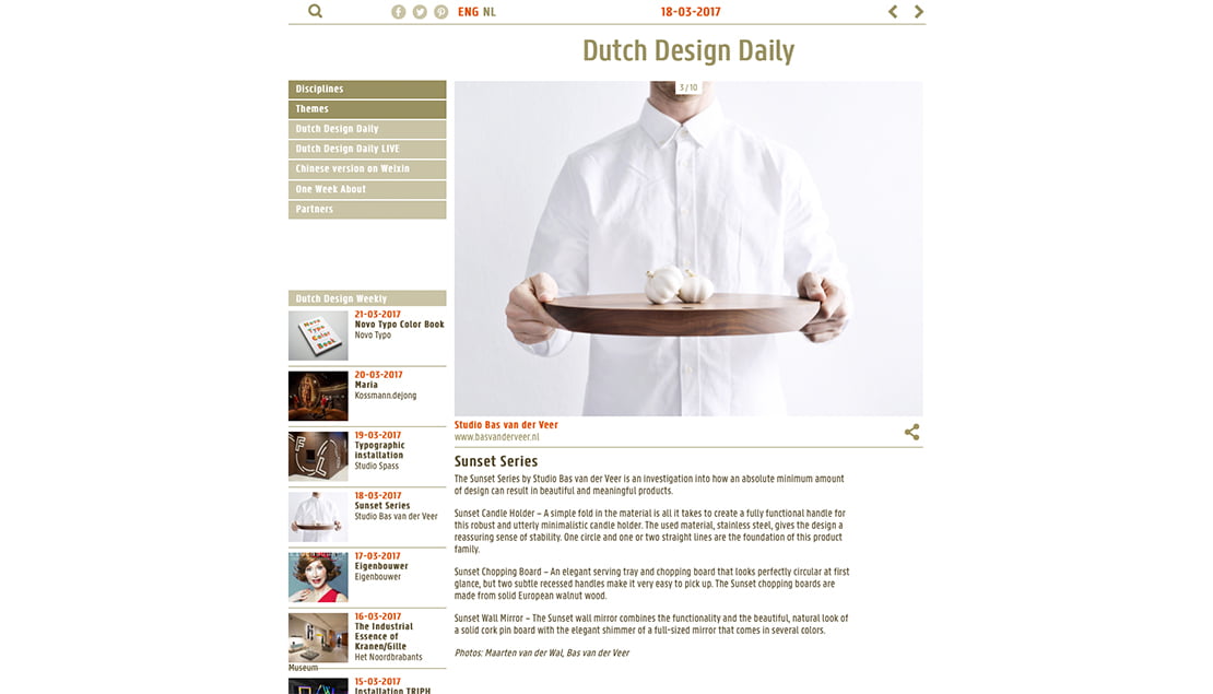 Ons initiatief Dutch Design Daily slaat een brug tussen de Nederlandse ontwerpers en het grote publiek. Het is een online platform waarop we iedere dag een nieuw actueel onderwerp tonen en bespreken op het brede gebied van Dutch Design zoals, architectuur, digital design, grafische vormgeving, mode & textiel, product design en ruimtelijke vormgeving. Ook lees je er interviews met ontwerpers en is er aandacht voor onderwijs en erfgoed. Het Nederlands ontwerp staat internationaal hoog aangeschreven en Dutch Design Daily wil dit graag delen met iedereen die geïnteresseerd is in Nederlands Ontwerp. We zoeken de verdieping door samen te werken met partners en in te zoomen op de verschillende designdisciplines. Zo is er een intensieve samenwerking met de Dutch Design Week in Eindhoven. Onder de noemer ‘One Week About’ worden er gastcuratoren uit diverse disciplines uitgenodigd om één week te vullen met een specifiek designonderwerp. We zijn internationaal georiënteerd: het platform is tweetalig (Engels/Nederlands) en in China te vinden op WeChat, de Chinese variant op Facebook.