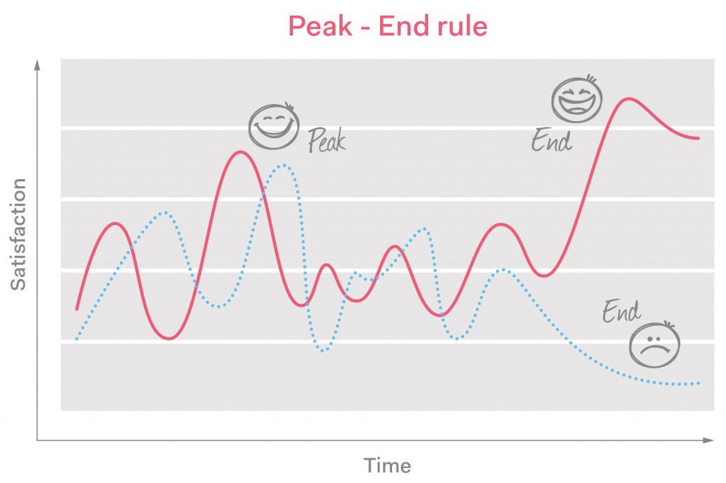 Ook bij de beoordeling van de customer experience werkt dit zo. Bij de IKEA zorgen ze ervoor dat ná het dal (die ellenlange rij bij de kassa) nog een positieve opkikker komt. De hotdog van 50 cent en het ijsje dat je onbeperkt kunt bijtappen, is de investering van IKEA die ervoor zorgt dat jij terugkomt. Weer een reden waarom zoveel mensen IKEA-spulletjes hebben.