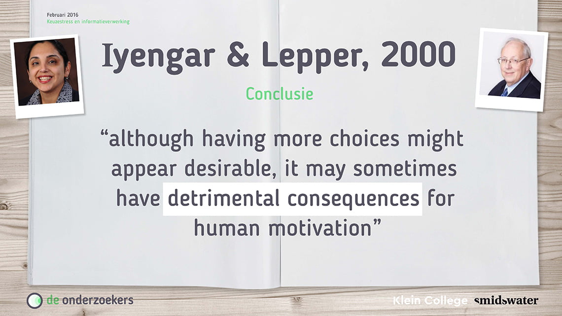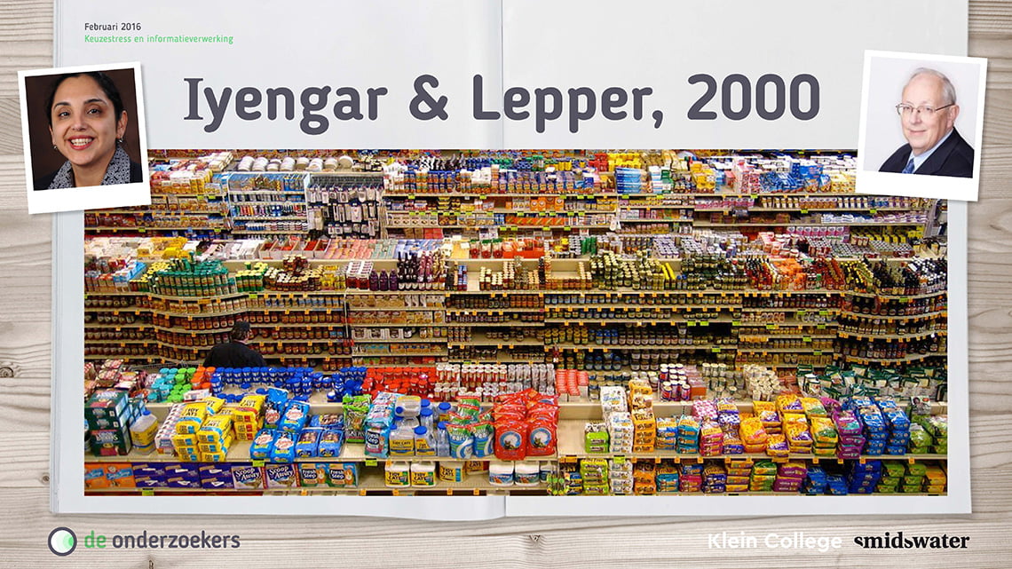 Marijke liet de uitkomsten zien van onderzoek door Iyengard & Leppen. Een experiment waarbij in supermarkten proeverijtjes waren ingericht voor jam. Om te onderzoeken wat aanbod precies doet, werd gevarieerd met het aantal producten op de tafel. In een opstelling was het aanbod beperkt tot 6 verschillende smaken. In een andere opstelling kon worden gekozen uit wel 24 smaken. Wat bleek?