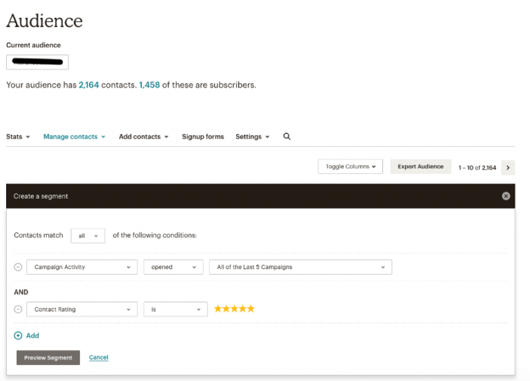 Ga in Mailchimp naar ‘Audience’. Onder ‘Manage contacts’ klik je op ‘Segments’. Hier stel je regels op waar de segmentlijst die je wil mailen aan moet voldoen. Mailchimp biedt een heleboel opties wat segmentatie betreft. Koppel deze segmenten aan elkaar om specifieke voorwaarden te creëren waaraan een lid moet voldoen. Je kunt hier zelf aangemaakte tags selecteren. Een voorbeeld is ‘Campaign Activity’. Dit segment geeft aan hoe actief de leden zijn in jouw algemene maillijst. Wil je alleen lezers mailen die jouw e-mails vaak openen? Hiermee verhoog je waarschijnlijk de ‘open rate’ en de doorklikfrequentie. Kies er bijvoorbeeld voor om alleen leden te mailen die jouw laatste vijf mails of een specifieke nieuwsbrief hebben geopend.