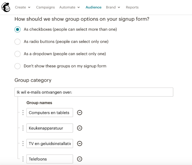 In Groups kiezen je leden zelf tot welke groep ze behoren, bijvoorbeeld door middel van een checkbox in je aanmeldformulier. Jouw doelgroep kan zien bij welke groep ze binnen je e-maillijst horen. Mailchimp creëert op deze manier automatisch verschillende groepen op basis van bijvoorbeeld interesses, de frequentie waarmee iemand gemaild wil worden of een voorkeurstaal. Je kunt je leden ook zelf indelen in bepaalde groepen. Wil je liever ‘anoniem’ groepen creëren? Dan is het handiger om te kiezen voor segmentatie via tags.
