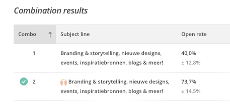 Goed testen mag natuurlijk niet ontbreken: met A/B-tests meten wij voor onze klanten bijvoorbeeld wat het effect is van verschillende titels en lay-outs op de openratio en doorklikratio. Alle kleine veranderingen kun je meten. Uit de test hieronder bleek de nieuwsbrief mét emoticon in de onderwerpregel bijvoorbeeld aanzienlijk beter geopend te worden dan de mail zonder emoticon.