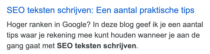 De meta titel mag in totaal bestaan uit 60 tekens en wanneer je dit overschrijdt, snijdt Google een stuk van de titel af in de zoekresultaten. Wanneer je dus een lange titel hebt voor een blog, probeer dan de zoektermen in het eerste deel van je meta titel te zetten. Dan zal het relevante gedeelte niet afgesneden worden. Hieronder het voorbeeld van deze blog, waarbij de optimalisatie is gedaan op ‘SEO teksten schrijven’.