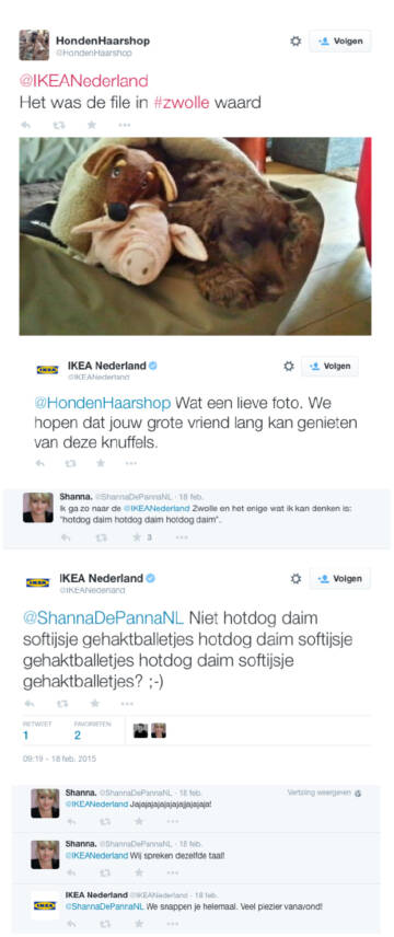 In dat kleine stukje tekst belooft IKEA je gezelligheid, ontspanning, vrolijkheid en duurzaamheid, op een betaalbare manier. Én voor iedereen, of je nu wel of niet een eigen tuin hebt. Zo herkent bijna de hele doelgroep zich in de tekst, en door het tutoyeren komt de onderneming nog eens extra dichtbij de lezers te staan. Op social media, een van de meest directe online aanspreekpunten voor klanten, reageert IKEA ook altijd sociaal en waar gepast met humor: