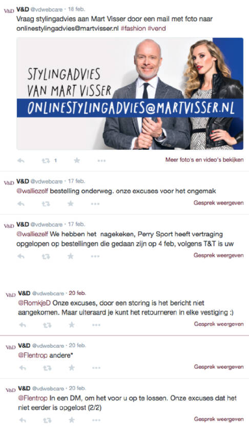 V&D ‘maakt’, ‘ontvangt’, ‘is’, ‘laat zien’: de beleving wordt vanuit V&D verwoordt. En hun doelgroep staat afstandelijk beschreven als ‘consumenten’. De gezelligheid en het plezier stralen er nog niet echt van af. Ook op de social media van V&D zit geen helder management. De officiële V&D-twitter doet het redelijk met geplande tweets, maar reacties op klanten zijn erg slordig: medewerkers gebruiken ‘u’ en ‘jij’ door elkaar, en maken opvallend veel taal- en spelfouten.