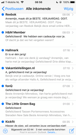 Inmiddels is het voor veel bedrijven geen rocket science meer: het versturen van verjaardagsmails. Dat bleek wel op mijn verjaardag dit jaar (zie de afbeelding hieronder voor de overkill aan verjaardagswensen). Zijn deze e-mails daarom achterhaald? Blijkbaar niet. Het Nationaal E-mail Onderzoek 2018 benadrukt hoe belangrijk ontvangers deze verjaardagsmail vinden. 47% waarderen de aandacht. De felicitatie geeft ze het gevoel dat ze deel zijn van jouw club.