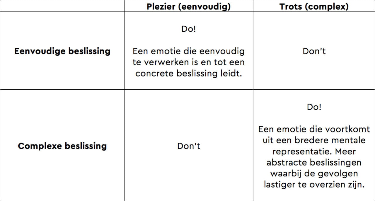 De construal-level theorie laat het verschil zien tussen eenvoudige en complexe beslissingen, die elk op een eigen manier in ons brein verwerkt worden. Het meest interessante onderdeel? De magie die ontstaat wanneer het type beslissing overeenkomt met een emotie die daar goed bij past. De overtuigingskracht van een reclame is sterker wanneer de emotie die gebruikt wordt overeenkomt met het type beslissing (eenvoudig of complex).
