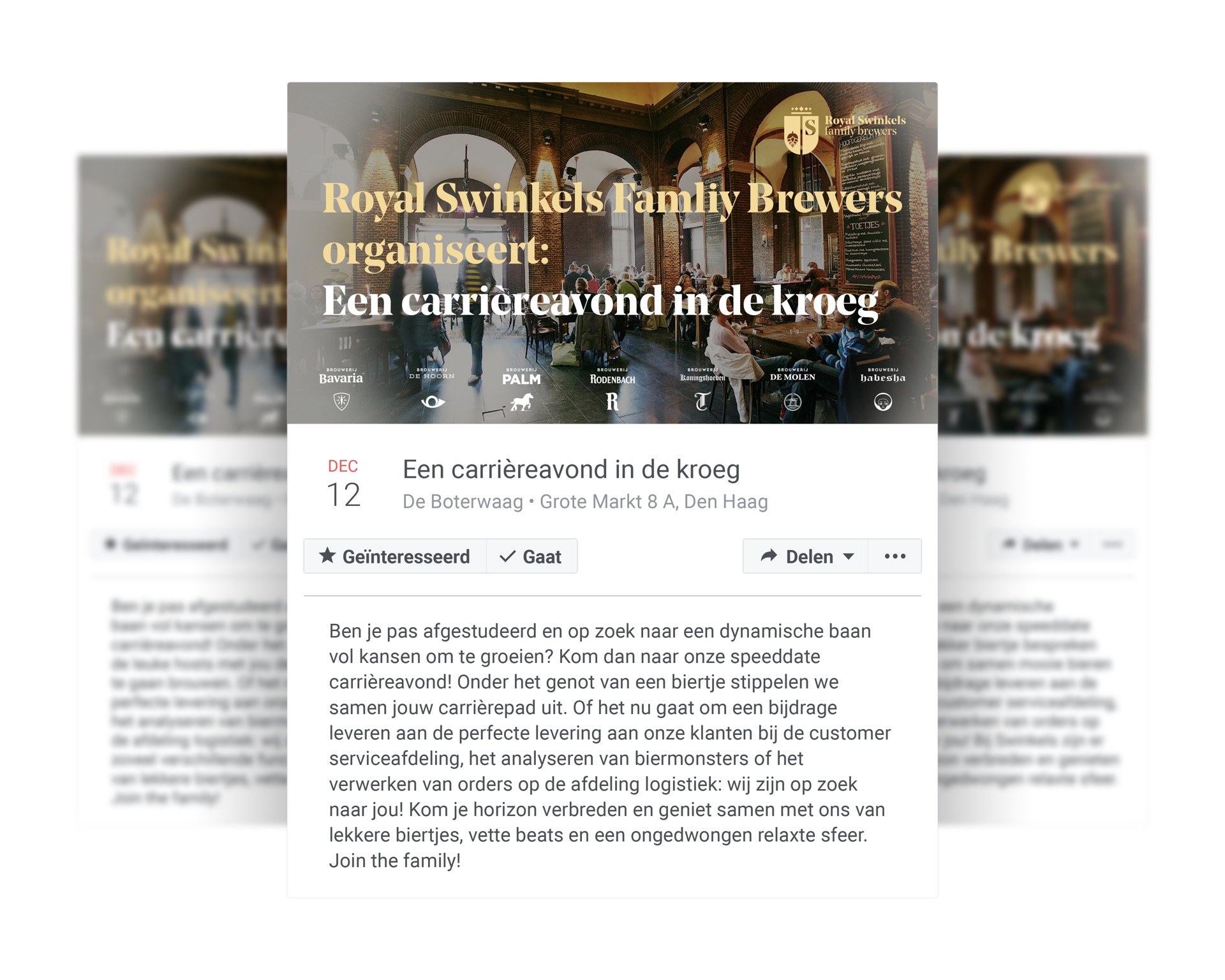 De employer value proposition werkten we uit in een creatief concept, samen met een plan voor de uitrol van het employer brand. Met concrete uitwerkingen voor de ideale employer journey, van recruitmentmarketing tot employer engagement. Zo zetten we het employer brand van Swinkels Family Brewers sterker dan ooit op de kaart. Ready for the next generation.